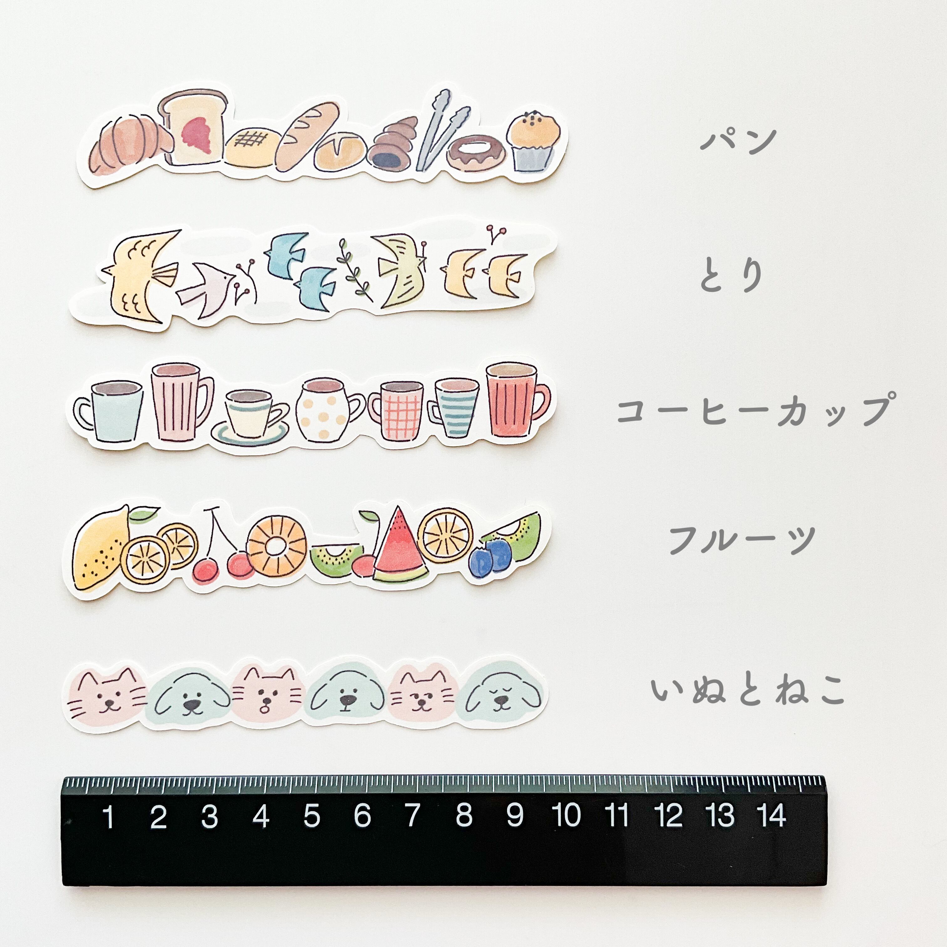モチーフを横に並べたデザインで、手帳やノートのページの下に貼ると簡単に可愛くなります。
