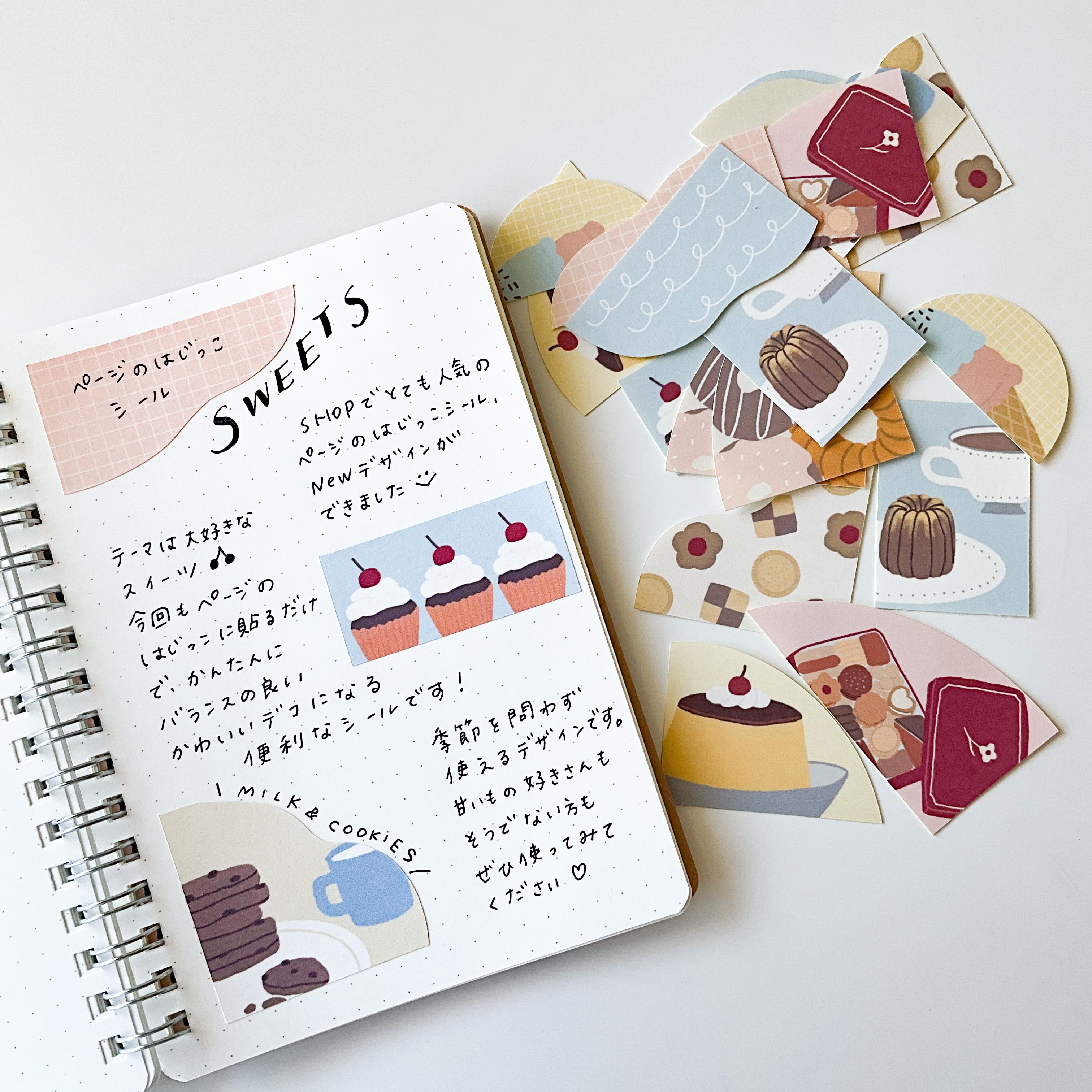 ショップの人気商品、「ページのはじっこフレークシール」の新デザインは、スイーツがモチーフです。